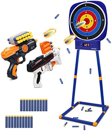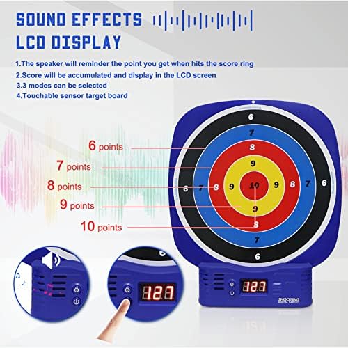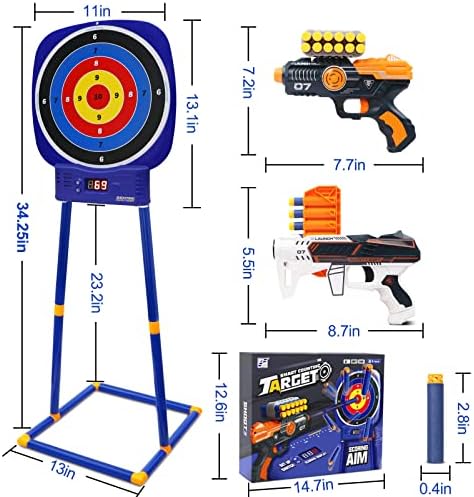 🎯🔫 2 DIFFERENT FOAM DART BLASTER TOYS FOR BOYS : The light-weight dart blasters can shoot out long distance. Target practice is a rewarding and interesting experience for young kids to satisfy their curiosity. Let your kids excited to start fun target shooting games for kids with friends! What’s more, these dart board toy set is also great for teenagers and adults playing. 🎯🔫 3-IN-1 ROUND TARGET : Digital shooting target set come with large 11” target board. It can be used in varity of different situations, such as you can place this electronic target on the smooth ground/table, hang it on the smooth wall/glass or assemble it in the stand. The stand is very easy to assemble so shat kids can refer to the instructions to install it by themshelves, which can improve their hands-on and thinking skills. It is a perfect indoor & outdoor toys for 5-12 years old boys. 🎯🔫 BUILT-IN AUTOMATIC SCORING & 3 GAME MODES : Unlike the traditional shooting targets on Amazon, our round digital target toy has 5 rings shooting area, and the digital archery target features automatic scoring equipped with sensors that the scores are displayed in the LCD screen based on the scoring area you hit. Our round electronic scoring target set built-in 3 different game modes, which brings more fun for children. Best gifts toys for boys age 4-7 8-12. 🎯🔫 COMPETENCY DEVELOPMENT : Standing target shooting practice develop kids’ hand-eye coordination for kids in a challenging way. Let your kids have fun while practicing their accuracy skills, motor skills which helps to improve concentration in your kids. This outdoor shooting toys set come with 1 electronic round scoreboard, 2 foam dart blasters shooting toys, 20 soft foam darts,1 suction cap,1 bracket,1 screwdriver. It is highly recommended to those who love digital shooting games. 🎯🔫 BEST BIRTHDAY & CHRISTMAS GIFTS FOR KIDS : Round target playset comes with an exquisite gift box. It is perfect birthday, Christmas gifts for 4,5,6,7,8,9,10+ year old boys girls kids. Shooting game toy can keep your kids away from electronic devices, perfect for Birthday Parties, Family Gatherings, or Outdoor Entertainment with friends or family indoors or outdoor play. Shooting toy games will bring kids with a variety of gameplay and endless joy.