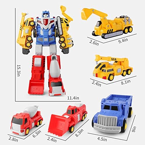 MEGA ROBOT ACTION FIGURE: 5 toy trucks building robots cars toys for boys 3-5 years oldthat transform into giant Pull back truck, and when put together they create one ROBOT!! Playing with these kinds of toys will provide your child with hours of imaginative play. It helps promote hand-eye coordination, cognitive ability and motor skills. MORE PULL-BACK TRUCK COMBINATION: This toy has more than 12 small parts, giving it a variety of potential combinations. For example, they can build longer cranes, or form multi-purpose trucks with both crane and excavator functions. Each truck can move independently, they just pull them back and release to see them sliding on the floor. MAGNETIC ASSEMBLY: Construction toy truck can be assembled and disassembled because they are made of magnetic splicing which this assembly method is simpler and more convenient. Each small part has a magnetic force, assembling into a big robot through the magnetic spots. You don’t need to worry about magnetism, because the strength of the magnet is designed to protect the safety of children. EDUCATIONAL BENIFITS: Only need some sand, you can create your own construction base that simulate the transport of construction sites carrying sand and other materials. The realistic moving parts such as toy excavator can move 360 degrees add to its detailing and keep your child involved in playing with the truck for hours. Great kids toys for boys age 4-7. A CANT MISS GIFT: Our products are made of high-quality, non-toxic materials and BPA-free. Realistic lights will flash with robot voice sound. The construction truck set makes an excellent gift for your child on birthdays, Christmas, summer holidays or any other occasion for 3 4 5 6 7 8 year old boy and girls.