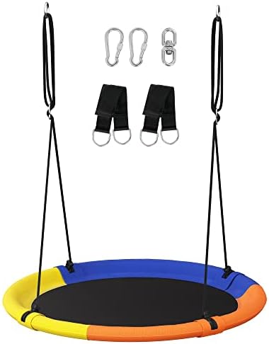 Happiness Is a Swing: Set this saucer swing in your backyard, watch your kids swing back and forth, “fly” high and low, laugh loud and happily. All you need is a flying saucer swing to turn your garden into kids’ paradise Safety First: With kids’ safety in mind, it’s made with strong PP, durable synthetic fabric, 9 mm dia. ropes, lockable carabiners, and a steel swivel hook—all for a load capacity of 700 lb (TÜV Rheinland tested) and so you can keep your mind at ease Large Swing, Comfy Swing: Which kid goes first on the swing? Fight’s over. With such a large 40” dia. seat, your kids can share this tree swing and play together! Plus, the edge is padded to make little ones’ time on the swing even cozier Can’t Wait: Your excited kid can’t wait to try his new swing? No problem. With all accessories for assembly included, you’ll be setting it up easily and enjoying the laughter of your little one on this tree swing in no time Childhood Memories: Remember the happy days of swinging in your backyard when you were a kid? Gift this saucer swing to your little ones and create a wonderful childhood memory that will stay in their heart, too