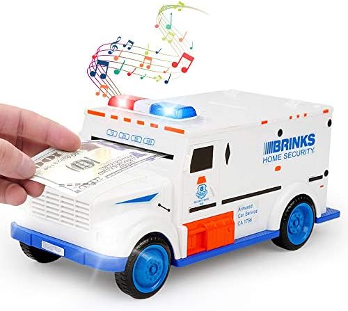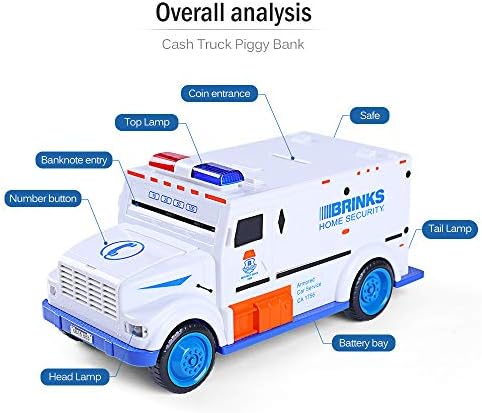 【Special Armored Car Kids Piggies Bank】- This is a armored driving car shape money bank that is more fun than a traditional piggy bank. Kids could set his own password and enjoys that it “eats” both the paper money and coins. The bills are pulled in by a sensor, which kids absolutely love to do over and over again! 【Electronic ATM Style Password Bank with Music & Lights】- When the banknote aim at cash inlets, it can automatically absorb with cool lights and music. Your kids will love placing money in their new car truck coin bank and taking them out and driving it around. 【Password can be Personalized Money Safe Bank】- The password button is hidden in the front cover of car. The code is preset but can be personalized. If forget the new code you can simply remove the batteries and wait for about 20 mins, it will reset the default code to “0000”. This funny design that appeal to your kids attention. 【Roll Like a Toy Car】- This car banks can also roll like a toy car, allowing your child to experience the fun of saving money. The lights will flash and the bell rang when you press the number button.Two Languages can be chosen. It has 2 lights. The red light indicates that you have input the wrong code. The blue light indicates that the code is correct. 【Powered & Size】- This money box is operated by 3*1.5V “AA” batteries (Batteries not included). Car bank Size: 10.4 *4.9 *4.3 inch. It’s made from environmental ABS plastic material, sturdy and not break easily. design. Great Christmas gift for children,Ideal Birthday gift for kids.