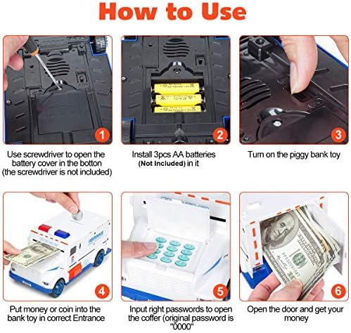 Unique Money Bank: Sopu piggy bank has a cool appearance,which can stimulate your child’s desire to play with it all by themselves for a long time. The music sound, lights flash effect and there is a cute type of sound make ATM style numbers and code for opening should be really interesting for boys and girls. Enjoys putting in money, taking them out and driving it around and cultivating your child’s habit of saving money since childhood. Prepare for Use: Before use,insert 3*AA batteries(Not included), turn the coin bank on.You will find a language switch button at the truck inner.Two language can be chosen.(Chinese and English). How to Withdraw Money? “Enter the correct passwords,the door opens automatically .If your passwords are wrong,the red light flashes and the alarm sounds. The door cannot be opened, and the initial password is “”0000″”. “ How to change passwords? 1.Enter the current password (default 0000) to open the safe door. 2.Press and hold the * button, the red and blue light flashes (hold the * button not to loosen). 3.Press the new 4-digit code within 15 seconds, then press # button and the light stops flashing. 4.Release the * button and close the door. Why I press the password it recording repeats, “Password Please.” ? The “password please” is the same as hearing the beep sound when typing in your pin. So all you have to do is enter the pin just ignore the “password please” just push the password. Specifications: 1.Car Size: 10.4 *4.9 *4.3 inches 2.Item weight: 1.43 lb 3.Package Includes: 1* Piggy Bank 1* English Use Manual 4.Power Source: 3x 1.5V AA Battery(Not included) 5.NOTE: If you don’t use it for a few weeks, please remove the batteries.