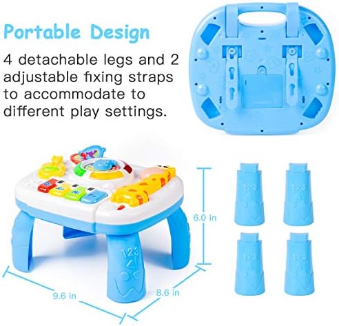 【Animals world】Flip the page, there are bird, elephant, and dog, you can hear the voice of these cute animals. There is also a beautiful giraffe to play with your lovely baby. The baby activity table can promote the development of children’s motor skills, creative play, recognition of colors, shapes, and animals. It is the best birthday gift for your lovely baby! Activity size:9.6 * 8.6 * 6.0 inch 【Activity Table】6 months up baby activity table with multi-function.The learning table has do, re, mi, fa which is a simple experience of music. Baby Toys with colorful images and beautiful voices can draw kids’ attention to learning, helps the baby easier to recognize patterns, animals, and colors. The activity table for baby will be a surprise baby toys for 1 2 3 Years Old Boys Girls. 【Music&Light Function】A variety of music styles for baby to enjoy. When the clock pointer to point different areas, your baby can hear different songs. Colorful lights will flash when playing music. This baby musical toys learning table encourages the baby’s color recognition and hand-eye coordination development. 【3 IN 1 Activity Table】Baby can play with the activity table on the floor when sitting; Install the legs, your baby can play with the learning table when standing up. Sturdy Legs can be assembled or removable according to your needs; Remove the legs, music table can be tied to a baby bed or car for your little kids to play. This activity table for toddlers 1-3 come with 2 adjustable fixing straps, you can fix it to different play scenes. 【High Quality Baby Toys】Made from safe and non-toxic ABS plastic, environmentally friendly to baby. Bright color Round edge design protects your baby little hands. Great baby toys 6 to 18 months, great gifts for any kids! The best musical toy for preschool babies, and Easter’ gift for your baby 6 months old and older. 1.5V AA batteries required(not included)