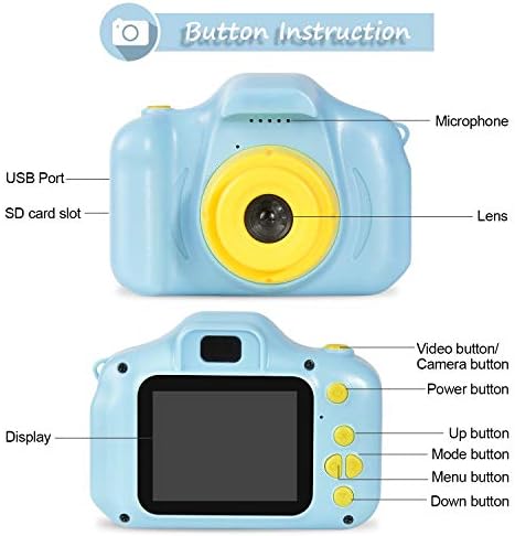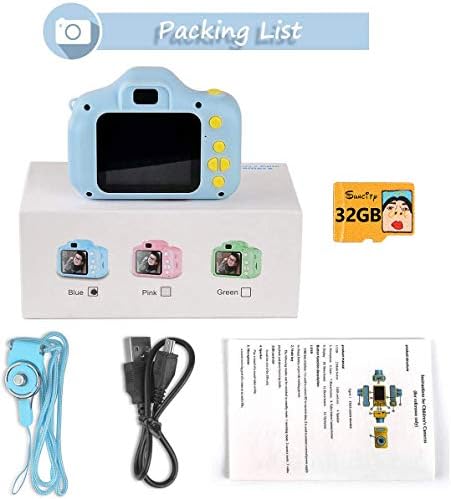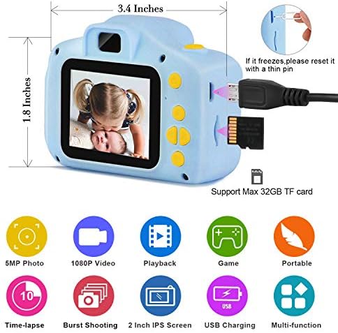 【Digital Camera Device for Kids】The kids camera digital equips with 2.0 inch IPS screen, 5.0 Mega pixels and 1080P HD video, 32GB TF card is included in the camera. 500Mah Lithium battery powers for the camera, which can last 2-3 hours when battery fully charged, also very convenient and fast for USB charging when the battery dead. 【Have much fun indoor or outdoor】The camera for kids has multiple functions, including take photoes, videoes, playback, voice record, delay capture, burst shooting, and puzzle games. 【15 Frames and 6 Filters for photoes】15 Frames and 6 Filters can be chosen to help the kids get different experiences for photographing, make it more funny. 【Best Toy Gifts for kids】This is the fantastic gifts for kids, toddler, girls, boys age 2-8 years old for Christmas Day, Birthday, New Year, Easter and other Holidays. 【Sales Service Guarantee】We have one year limited quality guarantee, you can contact us at any time if there is any problem about the camera or accessories.