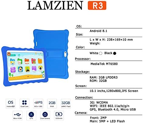 ☆【 LAMZIEN R3 10inch Kids Tablet 】 :LAMZIEN R3 features a powerful and energy-saving 1.8Ghz Quad-core processor, Android 8.1, 2GB DDR3L RAM, 32GB DDR3L ROM, with Kids software pre-installed, and hundreds of free pre-installed applications, childern tablets make it easy for child to explore games, many interesting puzzle games, books, music, movies, learning, Media, e-Book, Painting and Notes,etc. ☆【 10 inch Brilliant IPS display 】 :The 10.1 inch LAMZIEN R3 tablet adopts a 1280 x 800 IPS display, which presents a bright display with vivid colors for a more true-to-life viewing experience from all angles. This tablet is kid-friendly and has a 178-degree wide angle view presenting sharp and clear content for protecting kids eyesight.And perfect for watching Full HD video, playing games, reading magazines, and streaming content seamlessly. ☆【 Android 8.1 & Big Memory 】 :LAMZIEN R3 features Android’s latest version Android 8.1. Get rid of unexpected ads and have full access to Google Play. R3 with 32GB internal storage, and includes a microSD card slot (microSD card sold separately) that allows you to add up to an additional 128GB of memory so that you can keep photos, favorite movies, reading books, compatible games and apps you love, such as Skype, Netflix, YouTube, and more. ☆【 iWawa Kids software Pre-installed 】 :LAMZIEN R3 learning tablet for kids build in IWAWA app which has flexible parental controls allowing parents to create a profile for each of their children, set time limits, and give kids access to age-appropriate and curated books, educational apps, games, and videos. Parent Dashboard with Discussion Cards enables parents to discover the titles for their kids that they can enjoy and connect with them through rich conversations about these titles. ☆【 Specially designed tablet case 】 :The case comes with a stand which can free kids from holding the tablet. Durable, lightweight case to protect against drops and bumps caused by kids at play. Made of high quality soft silicone material, the bundled case is environment-friendly and harmless to health. No need to worry about any potential harms. The soft material brings soft and smooth touch experience.