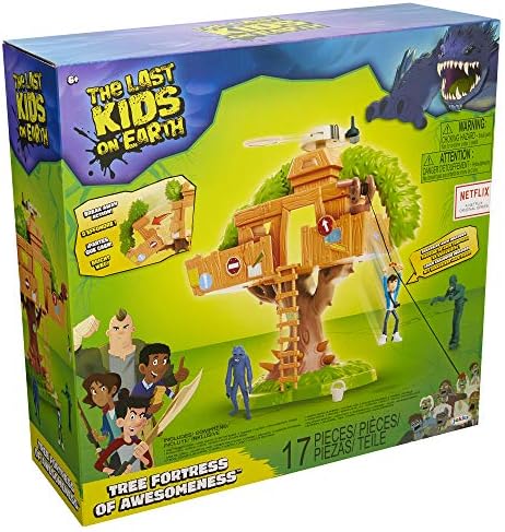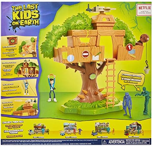 Based on the New York Times bestselling book series and Netflix series, The Last Kids on Earth features 13-year-old Jack Sullivan and his best friends Quint, June, and Dirk as end of the world heroes! The friends battle monsters and zombies, go on adventures, and try to survive and thrive in a post-apocalyptic world. With homemade gadgets, a tricked-out truck named Big Mama, and their friendly monster pet named Rover, they fight evil and make a home in their Tree House Fortress of Awesomeness. Battling villainous monsters transported to Earth during the apocalypse such as Dozers, Winged Wretches, and the evil Blarg, Jack and his friends fight to survive and bring peace to their home town of Wakefield. Help Jack, June, Quint, and Dirk defend their Tree Fortress of Awesomeness against Zombies and Monsters! Slide Jack down the Zip Line to face off against Chompin Blarg (sold separately), while fire disks from the disk launcher atop the Tree Fortress to defend it. Launch a disc at the tree target and watch one side of the Tree Fortress collapse as part of monster destruction. Decorate your playset with stickers for ultimate Tree House fun. The Tree Fortress stands overs 10 inches tall and can be used with The Last Kids on Earth figures (sold separately). The Tree Fortress of Awesomeness playset comes with 1 Tree Fortress, 1 ladder, 1 string, 1 hook, 1 bucker, 1 exclusive zip-lining Jack figure, 1 launcher, 3 disks, 2 zombies and 1 sticker sheet.