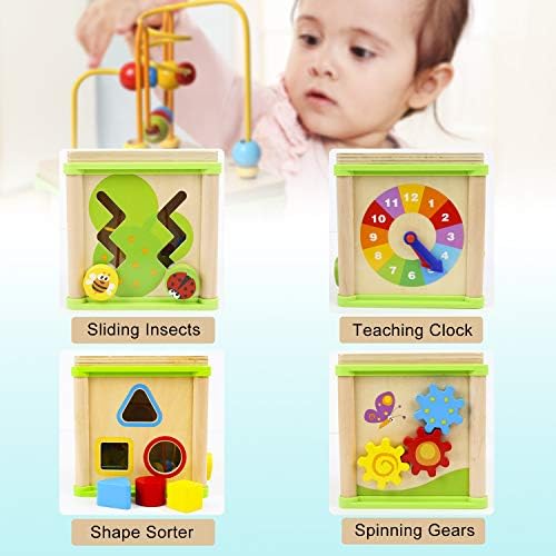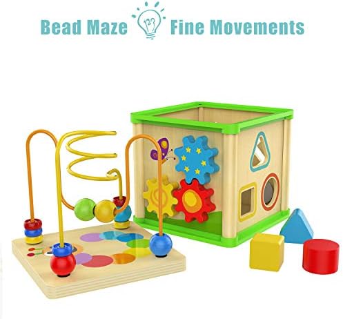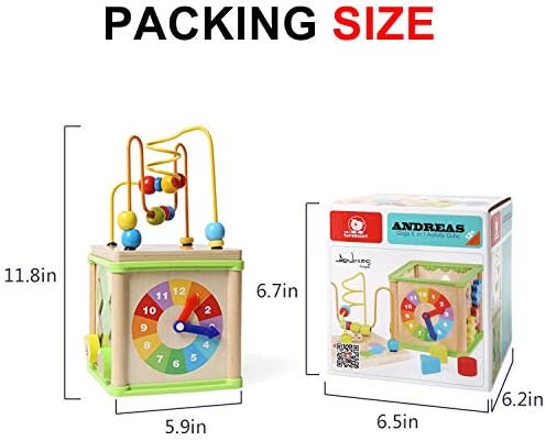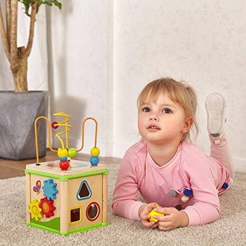 FIVE ACTIVITIES: Exploration and fun is around each corner of the activity cube toys for 1 year old boy and girl. There are 5 activities such as shape sorter and bead maze. Top bead maze can be used separately and easy to store when inverted. This multi-functional educational toy will attract toddler’s attention for hours as they will rotate from one side to another LEARNING IS FUN: The one year old girl boy toys help your baby learn and develop effortlessly. We use games to open up the world of body movement, natural observation and logical mathematics for 1-year-olds. While playing, your baby is able to strengthen arm muscles, form color, shape and time recognition and develop problem-solving skills GROW WITH KIDS: Of course with any toys for 1 year old boy and girl, safety is the top priority. The activity cube toy sized 11.8 x 6 x 6 inches has passed the highest toy safety standards of both the U.S. and Europe. Superior craftsmanship and sturdy construction make the wooden activity cube a priority choice at all ages from 1-year-olds to preschool children QUALITY MATERIAL: This wooden activity cube with colorful blocks was made from natural solid wood with polished edges and non-toxic water-based paint. It’s a great toy for 1 year old boy and girl. This strong and classic-designed wooden toy will withstand great without fading or cracking even throughout childhood IDEAL GIFT CHOICE: If you are searching for a birthday or holiday gift both educational and fun, this activity cube is the right choice that can not only satisfy all kids’ need but also reassure parents. It will be a hit with any toddler and approved of and appreciated by parents. A fun, educational and safe, ideal gifts for 1 year old boy and girl