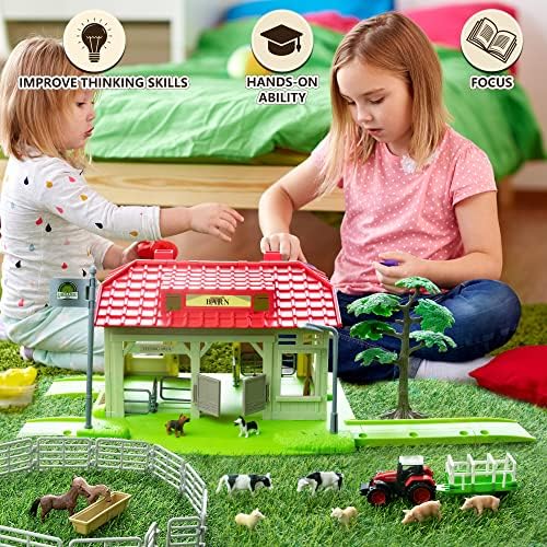 Toymany Farm Animals with Barn, Big Barn House with Farm Animals Figures Tractor Fence and Tree – Farm Animal House Toys – Learning Christmas Birthday Gift for Kids Toddlers