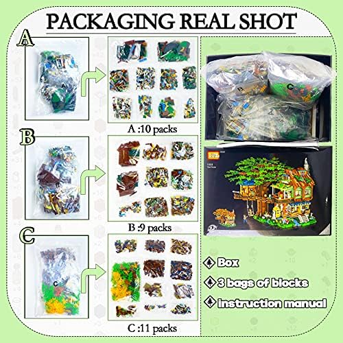 🌳Tree House Building Set: The tree with interchangeable summer and fall leaves, and there are chopping wood, dining room, bedroom, swing and a treasure chest etc. 🌳Exquisite Shape: These building blocks are based on the real building. Each element of the building is displayed in a miniature building block model. The parts are made of ABS materials, durable and eco-friendly. The building block parts have no burrs and feel smooth. 🌳Detailed and Color Building Instructions: The tree house building blocks set with paper instructions for assembling conveniently can be played with or used for display. Building these blocks, you can enjoy the fun while not getting bored. 🌳Best Gift Idea: This Tree House building kit is a perfect gift for birthday parties, Christmas, holidays, etc.These building blocks providing more creative and exploratory play fun. After assembling a fine building model, it is also a super great home decoration ornament. 🌳Attention: Since the particles are small, please keep them properly. Every piece of our product packing will not be confirmed until three tests have been carried out. If your sets are still missing pieces, please sent information to us. We will send the missing parts to you for free, thanks in advance.