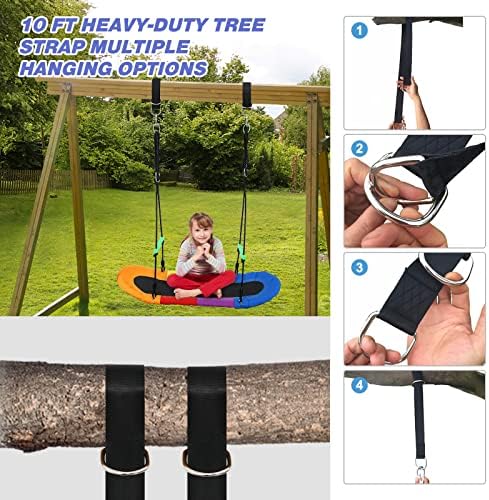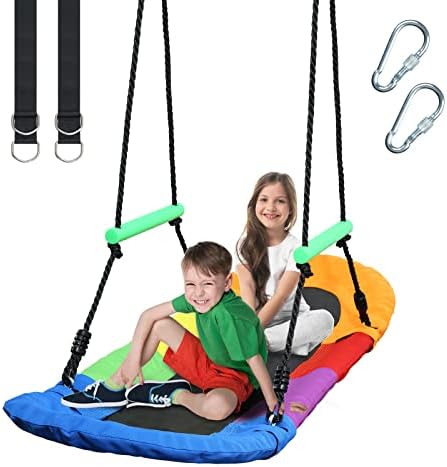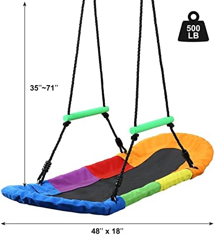 ✅500LBS OVAL SURF SWING: 48″ steel frame with tight weave 900D Oxford fabric , weight rated to 500 pound as a great platform swing, provides a fun hang out spot for kids, teens, and adults to safely swing during playtime or relaxation. ✅ADJUSTABLE HANDLES FOR MAX SECURITY: Our swing includes two plastic handles for kids to grab and keep balance when swinging high. And you can adjust the height to fit your kids’ needs! ✅MULTIFUNCTIOINAL SKYCURVE SWING: The unique curved design makes this platform swing more exciting and interesting than other swings! You can sit, lie, stand or surf on it, add more fun to you backyard adventure. ✅DURABLE SWING SEAT: The swing seat made with a high resistant steel frame covered in soft foam padding, with high-quality 900D oxford material and strong nylon ropes allows it to withstand rain or snow as well as the strong UV rays. ✅EASY TO ASSEMBLE: This round tree swing for outside includes step by step picture instructions, complete hardware and mounting gears. You can easily attach in minutes. Backyard swing or playground fun for kids, teens, and adults.