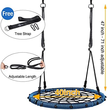 ✅STURDY AND LARGE SPIDER SWING: Large 40″ steel frame with tight weave rope net seat fits 5 kids or two adults. Weight rated to 750lbs as a strong round tree swing. Safer for child to swing for a long time. ✅SWING STRAPS INCLUDED: Our tree swing include 2 pack 5ft 2000lbs tree straps. No need to buy extra straps or other accessories. ✅DURABLE NET TREE SWING: Extra 71 inch long 12mm thick ropes are made from high quality PE webbing with metal rings for secured fastening. Adjustable length between 47 and 71 inch. Strong UV resistant and won’t fade for years. ✅PREMIUM ROPE SWING SEAT: Galvanized iron pipe is anti-rust and weather-resistant. Wrapped up solid rope fully to make the smooth surface which won’t harm people. Safer kids swings for trees. ✅ASSEMBLE TO SWING SET: Included step by step picture instructions, complete hardware and mounting gears, you can easily attach tree swings for kids in minutes. Backyard swing or playground fun for kids, teens, and adults.