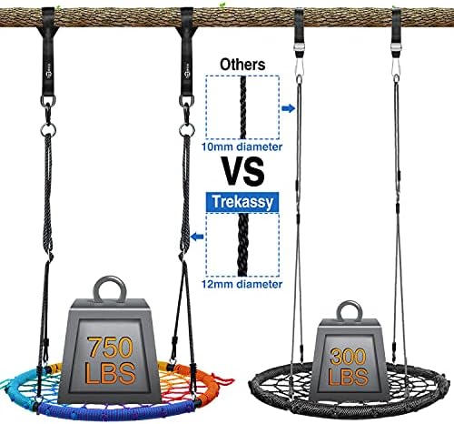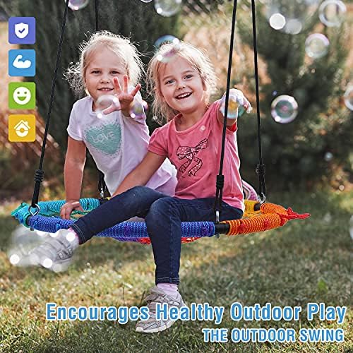 ✅STURDY AND LARGE SPIDER SWING: Large 40″ steel frame with tight weave rope net seat fits 5 kids or two adults. Weight rated to 750lbs as a strong round tree swing. Safer for child to swing for a long time. ✅FREE SWIVEL and SWING STRAPS: Our tree swing include 1PK swivel spinner, 2 pack 10ft 2000lbs tree straps, making the installation more flexible. You can hang with the spinner for 360°rotation or with the straps to fly back and forth. Customize your fun and Save your Money. ✅DURABLE NET TREE SWING: Extra 71 inch long 12mm thick ropes are made from high quality PE webbing with metal rings for secured fastening. Adjustable length between 47 and 71 inch. Strong UV resistant and won’t fade for years. ✅PREMIUM ROPE SWING SEAT: Galvanized iron pipe is anti-rust and weather-resistant. Wrapped up solid rope fully to make the smooth surface which won’t harm people. Safer kids swings for trees. ✅ASSEMBLE TO SWING SET: Included step by step picture instructions, complete hardware and mounting gears, you can easily attach tree swings for kids in minutes. Backyard swing or playground fun for kids, teens, and adults.