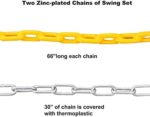 STRONG BUILT. The individual swing can hold up to 250lbs. Composed of two zinc-plated chains of Swing set that measures 66″” long each great for kids. 30″” of those chains are covered with thermoplastic to provide long lasting durability. The swing board is 26.5″”x5.5” allowing kids and adults to fit.