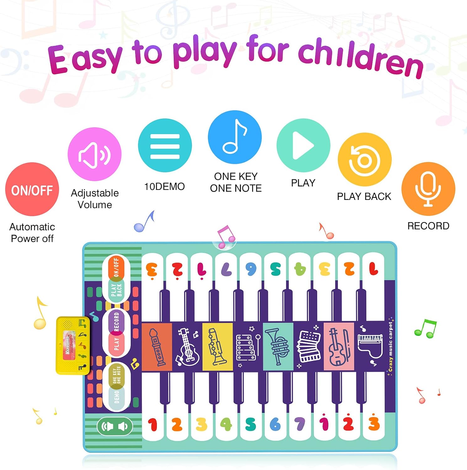 ♫♫【Record & Playback Function】:Musical mat for kids can be touched play by hands and feet. Press demo button to demonstrate music. Children can create and record their masterpieces on the piano mat, then press playback button to play the recorded melody, it is a funny way to inspires kids creativity. ♫♫【Safer for Child】:Piano mat uses safe and environmentally friendly non-woven fabric which is soft, waterproof, non-slipand and not easy to wrinkle. Another key thing to remember is that it is filled with cushioning sponge and has no sharp edges, so it will not hurt children’s hands. And easy to clean, you only need to take out the battery and wipe with a damp cloth to complete the cleaning. ♫♫【Powered By 3*AA 1.5V Batteries & Easy to Use】:Kids musical mat powered by 3*AA 1.5V batteries (not included), just install the batteries then turn on to play. It is easy to use for Child.Touch play music mat can be played by hands or feet, inspire children’s sport ability, and exercise the coordination of children’s hand and eye. ♫♫【Best Gift for Kids】:Colored piano dance mats can help children identify colors and animals, improve hand-foot coordination, help them gain basic knowledge of music, and encourage their imagination, teamwork and sharing, and sports activities. Our musical piano playmat is fun birthday/holiday gifts for boys and girls aged 2/3/4/5/6/7.
