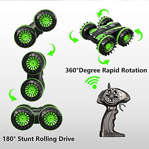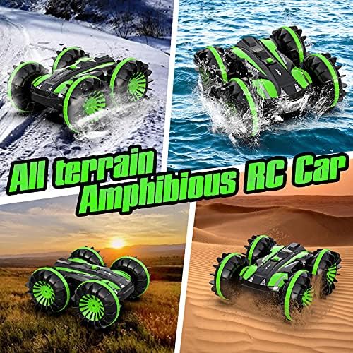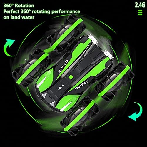 【RC STUNT CAR 360° SPINS AND FLIPS】The remote control car with the special double-sided design, front & back flips, 360 degree spins on the water and ground. The off-road design supports it to easily break through the land, beach, muddy, grass or ocean! 【2.4GHZ REMOTE CONTROL】2.4Ghz frequency is the updated new feature for this RC boat, which enable multiple remote control boat to racing together at the same time, without interference. This RC toy boat is very suitable for enjoying with family indoors and outdoors activities. 【HIGH QUALITY & EXCELLENT WATERPROOF DESIGN】Made of premium quality ABS and non-toxic PVC materials. The waterproof rubber design makes it has a strong waterproof, shockproof, to prevent the cabin from getting into the water, make the amphibious remote control boats moving in water and land or anywhere you want. 【AMPHIBIOUS RC CAR FOR KIDS】Amphibious remote control car is not only a land racer, also can surf on the water! These RC boats are suitable for all terrain with amphibious and complicated stunt action. Waterproof design makes the amphibious remote control boats moving in water and land or anywhere you want. 【LONG LASTING RECHARGEABLE RC BOAT】Comes with two 6V 400mAh Lipo rechargeable batteries for the remote control boat, charging fast and long-lasting of use. The best gift for Kids and Adults for birthdays, anniversaries, farewell, best wishes, Halloween, Thanksgiving, Christmas, New Year’s!