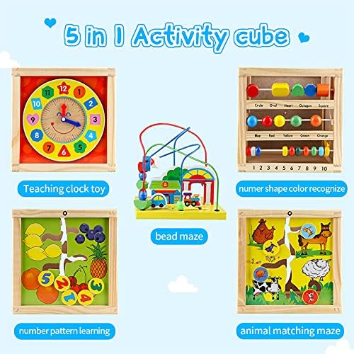 Vomocent Wooden Large 5 in 1 Baby Activity Cube Toys Bead Maze Shape Color Sorter Clock Birthday Gift for Girls Boys Toddlers Educational Learning Toys