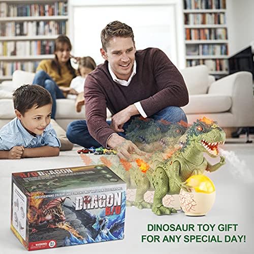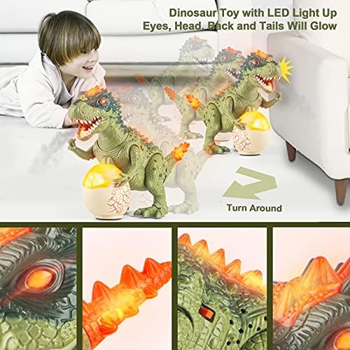 The Best Gift For Dinosaur Lovers — This T-Rex Dinosaur can Walk, Roar, Water Mist Spray, Shake Legs, Head & Tail. — Realistic Roarring Sound and Music, It provides your child with ample opportunity to explore their imagination. — LED lights in Red, Blue and Green Illuminate on the Back, head, tail, and Flash in the Eyes, Mouth& Dinosaur Eggs. — This T-Rex Dinosaur Can Turn Around Automatically When It Meets An Obstacle Ahead.