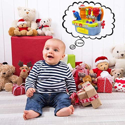 Electric drill: Stir the handle, the workbench makes sound like a real working electric drill, exercising the development of baby’s hand muscle. Chainsaw: Press down the handle, the workbench makes sound like a real working chainsaw, cultivating the development baby’s fine motor skill. Bench clamp: Turn the handle, the workbench makes sounds of “”Da, da, da…””, enhancing the coordination of baby’s fingers. Screw cap: Rotate the screw cap with screw driver or spanner, it will make sounds of “”Ka, ka, ka…””, exercising baby’s manipulative ability. Nails: Strike the nails with the hammer, the workbench will make sound of “”Ding, ding, dang, dang…””,building up the coordination between hands and eyes. Little ball: Pound the little ball with the hammer or use hand directly pressing it into the hole, the workbench make wonderful sounds and music songs, lights flash as well. Little collection box: Baby can learn to collect things by they own and keep the small gadgets out of loss. Digital scale: Move the nonius to certain number, the tool set bench will read this number out and play music, light flash as well. Shape match game: Embed the different shapes into corresponding slot, the bench will make sound of shapes. There are 5 songs in total of this bench for entertaining kids. Woby Workshop Tool Bench Construction Pretend Play Set Toolbox toys which is a fun add-on to any child’s collection.features a bunch of unique details for little kids who want to be engineers.