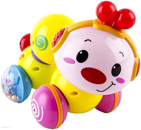 INSPIRES CRAWLING. Press down on the inchworms back to extend its body, then release. The inchworm takes off, racing on the floor to inspire babies to crawl along with it or toddlers to run after and chase it. HIGH-QUALITY CONSTRUCTION. Providing long-lasting strength and use, this Musical Press and Crawl Baby Activity Toy is expertly crafted using durable plastic construction to withstand endless hours of captivating play. MUSICAL FUN. Press the ear of the caterpillar to listen to a variety of child-friendly music, then press it again to shut it off. There are also rattling beads inside the clear wheels and a spinning head to hear more fun sounds. LIGHTS UP. Babies are attracted to bright lights and colors, and this toy has both. As you press the inchworms ear, the head lights up while the music is playing to keep children engaged and thoroughly entertained. GREAT GIFT IDEA. Furnished with great eye-catching colors, this developmental toy is the perfect choice for boys and girls 6 months and up. As such, it will make a great gift for holidays, birthdays and other special occasions.