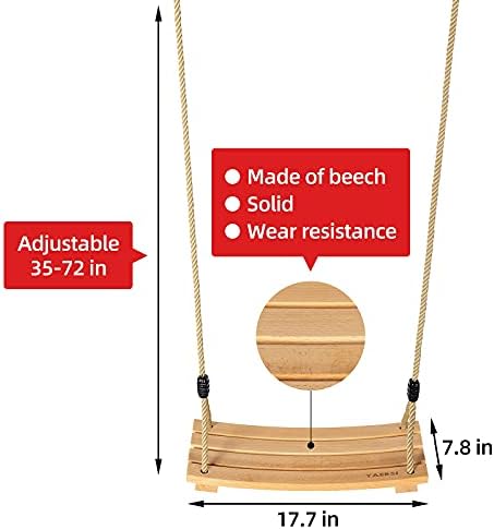 【220lbs Loading Hanging Swing】The wood swing seat with 185 cm adjustable rope metal loop, you can adjust it according to your needs. Maximum load-bearing weight: 100kg/220lbs, seat size:45x20x1.5cm / 17.7×7.8 x0.6inches, the tree swing suitable for children and adults, it is very safe for you and your family. Suitable for children over 3 years old and adults under 220 lbs/100kg. 【Indoor Outdoor Wood Tree Swing】 The wooden tree swing is made of durable beech wood and is designed for indoor & outdoor use.The natural wood provides you with a sense of security and comfort. Before playing outdoors, the paint on the surface of the wooden swing seat can protect you from mold. YAERSI ‘s swing use a unique hemp rope ,it better comfortable grab feeling and supports stronger anti-Fray. 【Unique Curve Shape Seat】Our swing seat board adopts a unique ergonomic bending design, which makes sitting on it more comfortable and children can have more fun. 【Enjoy A Whole Joyful Day With Your Family】The tree swing no hardware tools required to install this swing sets,very easy install.Comes with metal ring , provide multi-way to install (hang on the tree ,the pole or the beam.) Our tree swing seat can be enjoyed indoors for children, teenager and adults of any ages. 【Note】 Manual measurement, there is an error of 1-5cm. Children must be accompanied by an adult to play.Please do not expose the swing to the sun or in a damp environment for a long time.If you have any problem during the use, not satisfied with our products or services please contact us by email first time,we will try our best to offer you with satisfactory and friendly service.