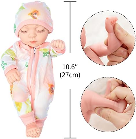 XFEYUE 10 Inch Newborn Reborn Baby Doll and Clothes Set Washable Realistic Soft Silicone Sleeping Baby Doll with Beautiful Flower Pattern Jumpsuit and Hat-Best Gift for Kids Girls
