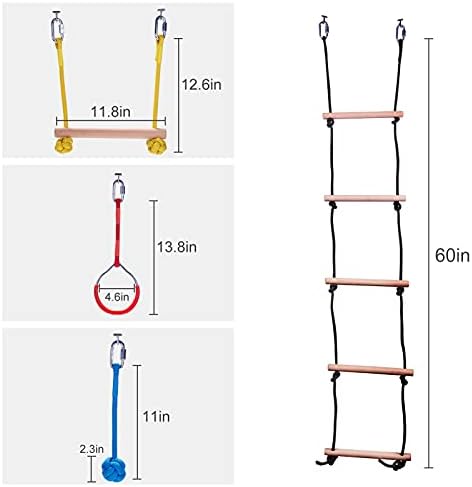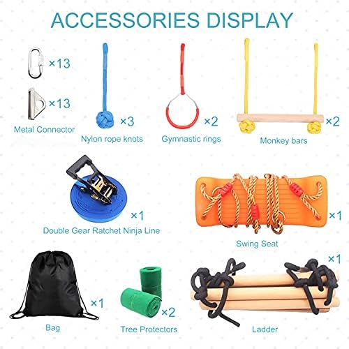 XIAPIA Slackline Warrior Obstacle Course for Kids-55FT Slackline with Swing Seat, Monkey Bars, Ring Wheel, Rope Ladder, Training Outdoor Playset & Backyard Jungle Gym Play Safe, Play Active: heavy duty slackline and durable accessories ensures that your kids is safety secured while challenging obstacle course and training. Each attachment can hold up to 440 lbs and the slackline can hold total 2000 lbs, enough for 2 or more kids/adults use at the same time. Easy to setup and bring with: Convenient design, easy to set up in just 8 minutes in your backyard or indoor. Store in the carry bag, put it in the trunk for summer camping, party challenge and beach trips. Please tighten the ratchet as much as you can to avoid sagging. To avoid the line been cut by the metal buckles, please loose the ratchet after use and keep the line away from the rain. The Best Outdoor Gift: Great gift choice for camping and backyard. Kids will have so much fun with those ladder, swing and obstacle attachments on the slackline. WE WANT YOU TO BE 100% SATISFIED: Any problem please do not hesitate to contact us with your order number.Fully refund with no hassle if unsatisfied in the first 30 days after you received the item.