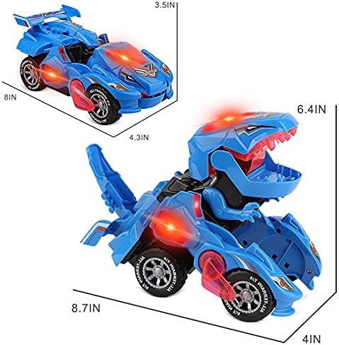 As a powerful but extinct species, dinosaurs are always a great attraction to kids. Therefore, dinosaur toys are always keeping their popular status among all the toys. This dinosaur toy car is exactly what an dinosaur toys lover would want. Your kids will surely love the dinosaur transformer toys. It’ll take them back to the Jurassic period once they see the car convert to dinosaur. Discover a new world of dinosaur with the dinosaur transformer toys, keep your kids get away from video games. FEATURES Two in one transformers dinosaur car. Designed with LED lights and music, attract kids eyes. Environmental plastic material, non-toxic and durable. Anti-fall car body material, strong and resistant to fall. Smooth edges, won’t hurt kids small hands, exquisite details. Keep your little ones busy for hours with this fun and innovative toy! Perfect educational learning tools that can stimulate preschool toddler’s imagination and encourage creation. NOTE 1. Please use a screwdriver to open the back cover at the bottom of the car to install the battery. 2. Please remove the wheel protector before use. If you don’t remove it, the car will not drive normally. 3. Batteries are not included, so please buy high-quality 3*AA batteries for power supply before use, and please take out the batteries and place them properly when you are not using toys. PACKAGE INCLUDED 1 x Transforming Dinosaur LED Car with package box. 🎅 Automatic Transforming: Dinosaur car toy is a toy that combines dinosaur toys and toy cars into one! It can convert from a toy car to a dinosaur toy automatically after driving for a while, then change back into a toy car, going on driving. Once the toy car convert to a dinosaur toy, it makes a roaring sound. 🎅 LED Light and Music: Dinosaur toys and toy cars are always a great attraction to kids.The dinosaur transformer toys are just what an dinosaur toys lover would want.The transforming dinosaur led car with LED lights and music will make an amazing sounds and colorful light effects. Buy these cool cars for 3/4/5/6/7 year old boys girls. 🎅 Flexible Universal Wheel: When the universal wheel encounters an obstacle, the dinosaur toy car will randomly change its direction of travel. Notice: please remove the clear cap on the bottom before playing. 🎅 Safe and Durable: Made of premium ABS plastic and non-toxic environmental spray painting, more firm and durable car body. Size: 8*4.3*3.5 inch. Perfect for age 3+ kids playing. Notice: Powered by 3 * AA batteries (Not Included in the package because of the transportation restriction). 🎅 Anti-Collision and Shockproof: With 4 shockproof springs, the dinosaur toy car protects the body from crashing and makes the toy car driving smoother.