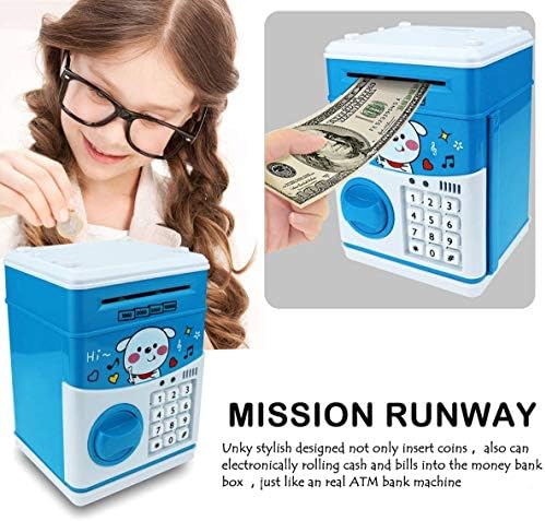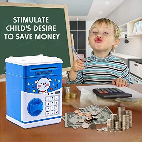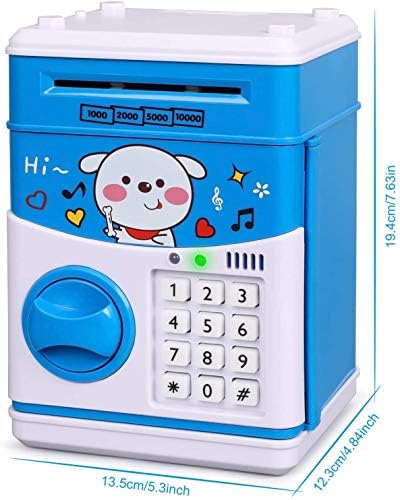 【Money Bank with Music Play Function】- With 11 built-in children’s songs, the music will start when you put the money into the piggy bank. 【Automatic Money Roll】- The paper money is put into the money box, the induction device is triggered and the cash money will be automatically involved. There is a coin slot on the top of the piggy bank to put coins to save money. 【High-capacity and High-quality】- The Money Bank is made of high strength environmentally ABS plastic, which is safe and durable. It can store 600coins or 300 pieces of paper money. 【Password Protection】- The original password is 0000, you can modified to a new 4-digits password. If forget your password, you can remove and reinstall the battery after 5 minutes. The password will be restored to “0000”. 【Best Gifts】 – What if you can’t open the door?1. Please take out the battery, wait for 5-30 minutes, and then put it back in, the password will be reset to “0000”2.You put the 0000 in and then press #. The pad will light up and you can then put whatever code you want in.3. It may be that your battery is dead, please change the battery! note. Do not use alkaline batteries!4.If you still can’t open, please contact us, our service until you are satisfied
