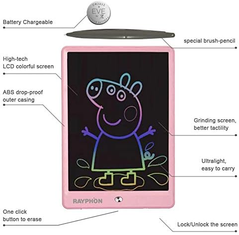 This high-tech LCD doodle pad without any blue light and ink, it can repeat 10 thousand times.Come with Upgraded Stylus that writes smoothly and easily.One Button Erase: Just one click, easy come and easy go.Added erase lock function: you can save what you want.Ultra-light design is easy for you to take it,even lighter than your phone!The durable and low power consumption.The button battery(CR2032) can last 8 months and can be replaced