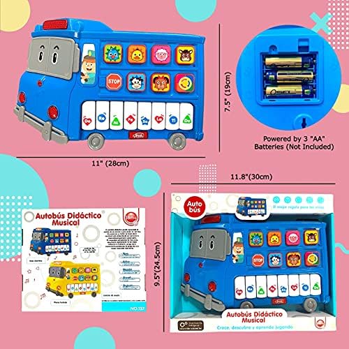 【Teach Spanish to Toddlers】Your toddler will learn Spanish and will have fun and be entertained with the toy’s multiple features and activities. (1) simulate playing the piano, (2) listening to musical songs and piano chords, (3) play the animal sound and names in Spanish speak, (4) learn the different musical notes like do-re-mi. 【Learn Spanish for toddlers】Built in with 4 modes switch of animal keys. Spanish Animal Toy can play the sound of an animal and pronounce animals name in Spanish ( Pajaro-Bird, Pato-Duck, Oveja-Sheep, Caballo-Horse, Vaca-Cow, Perro-Dog) , Plays hip-hop remix sounds, and has Quiz mode games where kids can assess what learned. 【Eye-catching Light Up Spanish Toy】It has a bright-colored flashing light that will surely capture boy and girl’s attention and help awake their interest and curiosity. It is benefit for baby cognitive development. 【Learning Piano Keyboard】Piano usually be the first musical instruments for babies. It pronounces the chords of the piano in words (Do-Re-Mi) and plays the corresponding sound. kids can learn all the basic musical notes of the Piano keyboard. Pre-programmed with 8 musical songs that the kids can imitate playing. 【100% Refundable】We guarantee high-quality and child-friendly products. In case you’re not satisfied, we accept returns and offer a full refund as long as the request is received by us within 30 days from receipt of the item. Take note that this item requires 3 AA batteries to operate but it is not included in the package.