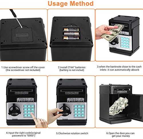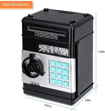 Adevena Electronic Toy Improve The Child’s Property safety Consciousness: “my own safe” guarding their own things. It can be used to store toys, jewelry, baseball cards, etc. insert coins into the top of the money bank and you insert bills into the side,just use the safe as a piggy bank. Password Safe Cash Box:Enter the 4 digit password(default: 0000,Changable passwords as you like), the green light will be on, the ATM can be opened. . If you enter the wrong password, the red light will turn on and the sound of “PLEASE TRY AGAIN” will prompt you (you can not open it,if the password it’s wrong) Automatic Roll Money ATM Bank: Put the paper money on the scroll, it can be rolled into the machine automatically.(But it doesn’t work if the paper is too old or too soft) Environmental protection materials: Environmental ABS plastic,No odor, anti-aging, durable and durable,adults and kids all can use it, large inside capacity, can help adults hold some private small items. High-capacity: Can store 600 pieces of coins or 100 pieces of paper money. interesting & funny, a must item for child or gifts, greatly help you to develop a good habit of saving money.